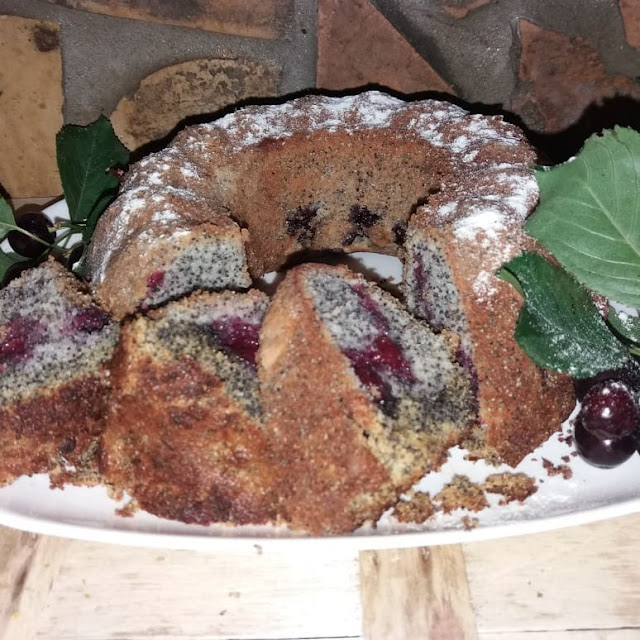 Zagrijati rernu na 180°C kalup za kuglof namastiti i pobrašnjaviti .Umutiti jaja i šećer, dodati vanilin šećer, ulje, mak, prašak za pecivo i brašno. Sve dobro umutiti i izručiti u kalup. Od gore rasporedite višnje. Pecite oko 35 minuta odnosno dok ne bude pečeno u zavinosti od rerne.