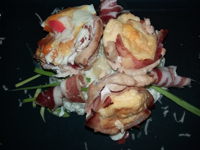 Belo pileće meso iseći na tanke šnicle I malo izlupati. Kalup za mafine podmazati President maslacom I obložiti piletinom. Zatim staviti po dve tanko sečene šnite slanine. Umititi pet jaja, dodati rendani sir I kajmak sve dobro sjediniti I sipati do ¾ visine mafina. Peći u predhodno zagrejanoj rerni oko 30minuta, odnosno dok ne bude pečeno Krompir obariti I iseckati na kockice, praziluk takoće sitno iseckati I sve dobro sjediniti sa pavlakom. Prohladiti malo pečene mafine I vaditi iz kalupa. Služiti uz prilog od pavlake, praziluka I krompira.